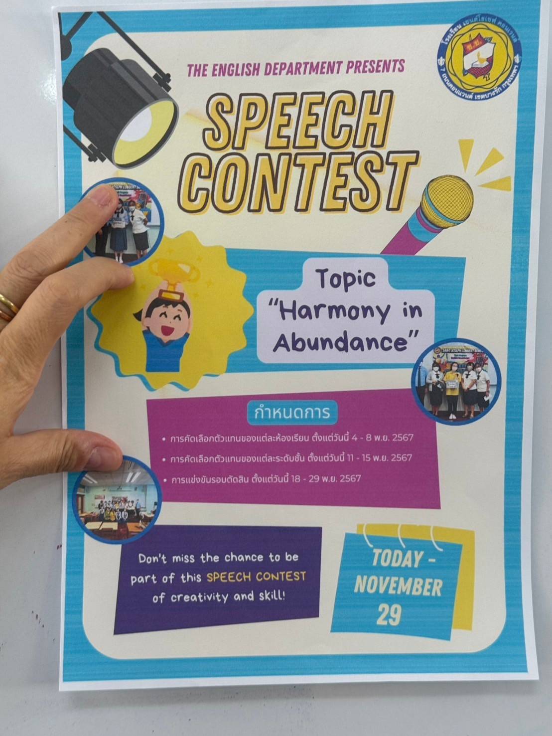 ฝ่ายวิชาการ กลุ่มสาระการเรียนรู้ภาษาต่างประเทศจัดกิจกรรมพูดสุนทรพจน์ภาษาอังกฤษในที่ชุมชน " Speech Contest " ระหว่างวันที่ 1 - 29 พฤศจิกายน 2567